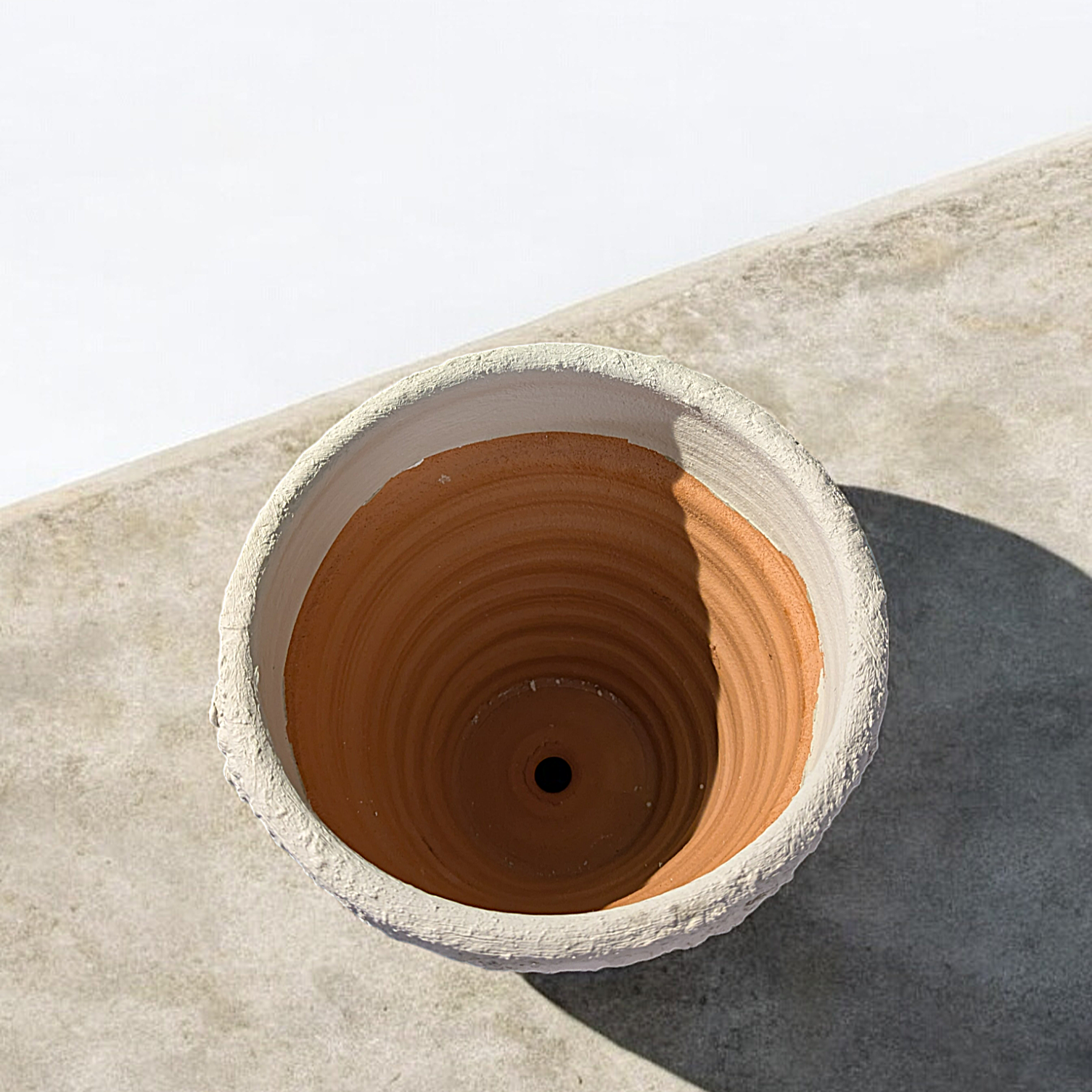This textured pot boasts a rustic, stucco finish that adds a touch of natural beauty to any space. Finished with a rough-hewn, distressed stucco that created a chunky, uneven texture, resembling an antiqued, industrial style. Its unique, uneven surface and neutral color palette create a versatile piece that complements various home decor styles.